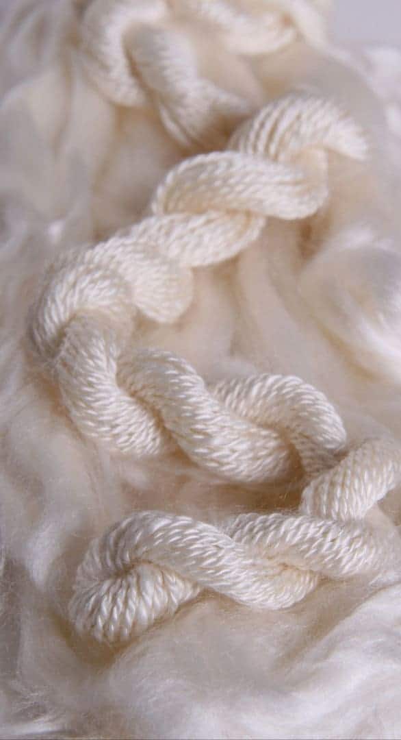 Zijde komt het beste tot zijn recht wanneer het gecombineerd wordt met een hoogwaardige wol. Voor een resultaat dat werkelijk ongeëvenaard is in zachtheid en luxe, adviseren wij om deze zijde te mengen met onze eigen DutchMerino wol. De fijne vezels van onze eigen kudde in Koewacht en de glans van de zijde vormen samen een droomcombinatie voor elke spinner en vilter.