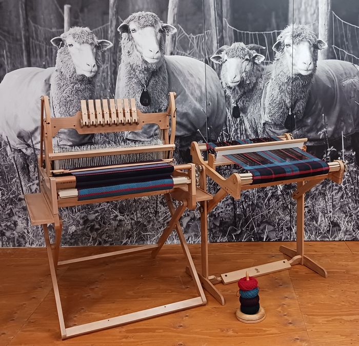 Voor dit experiment hebben we twee identieke scheringen opgezet met ons fijne Mandy garen. De uitdaging was om een klassieke Schotse ruit (Tartan) te weven op twee verschillende getouwen: